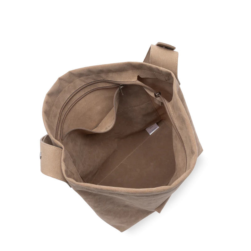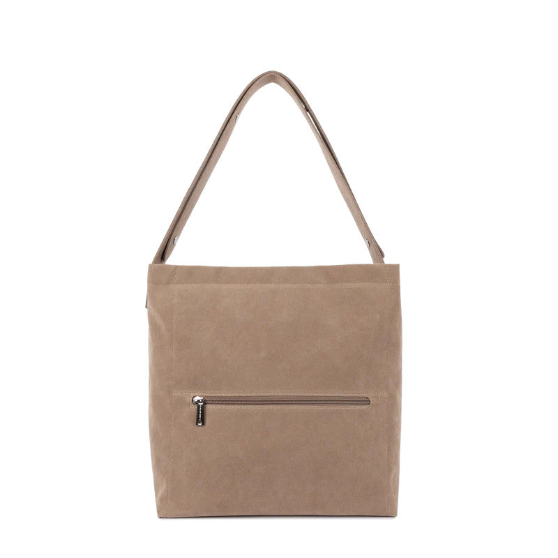 Ce sac seau est confectionné de polyester aspect suédine. Il possède une grande poche intérieure zippée ainsi qu'un emplacement carte frontale. Il se ferme avec une pression. Il se porte à l'épaule.